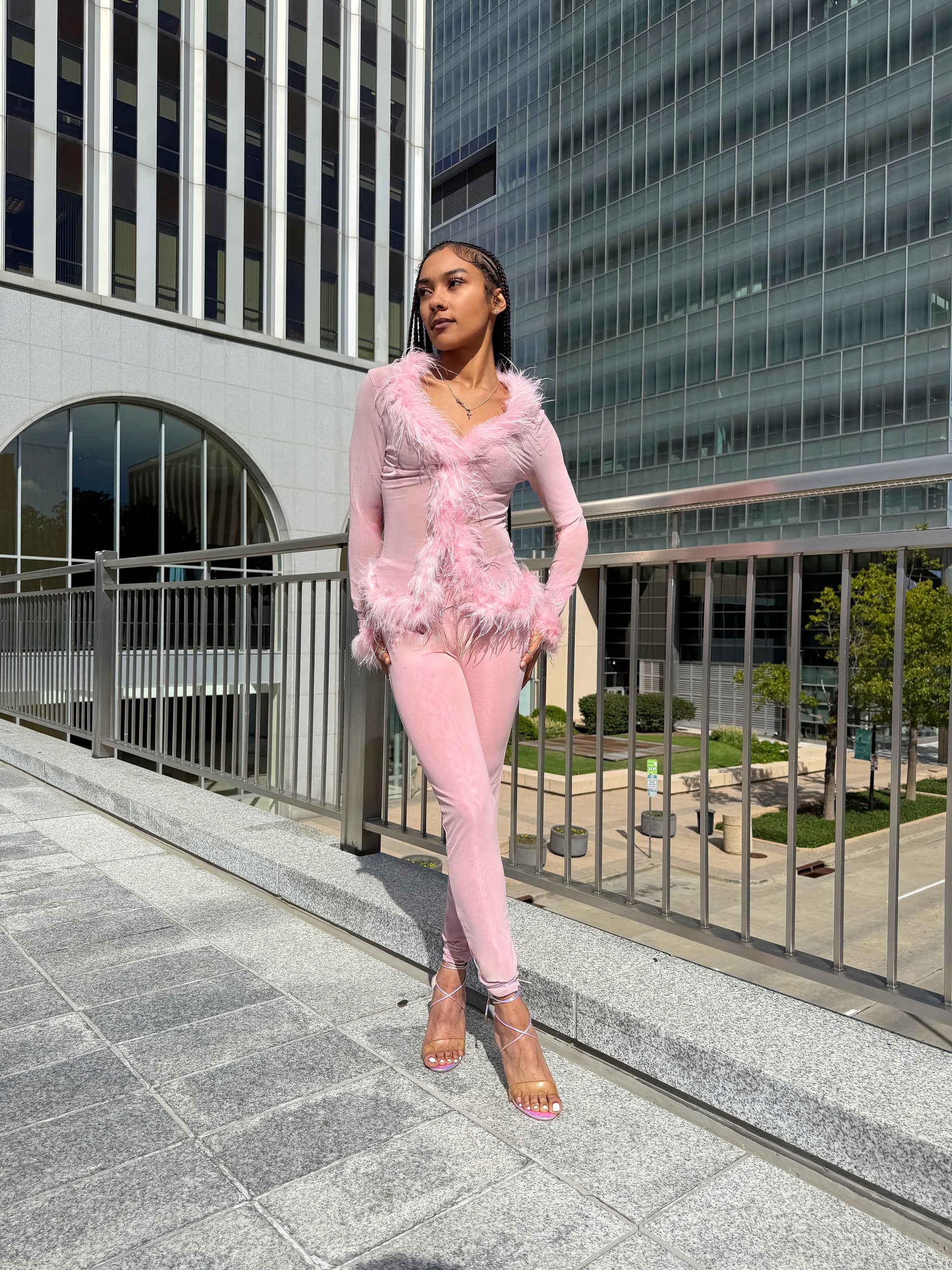 Two Piece Sheer Set. Fur Trim. True Size. Stretchy Fabric. Model Size: Small. Size Worn: Small