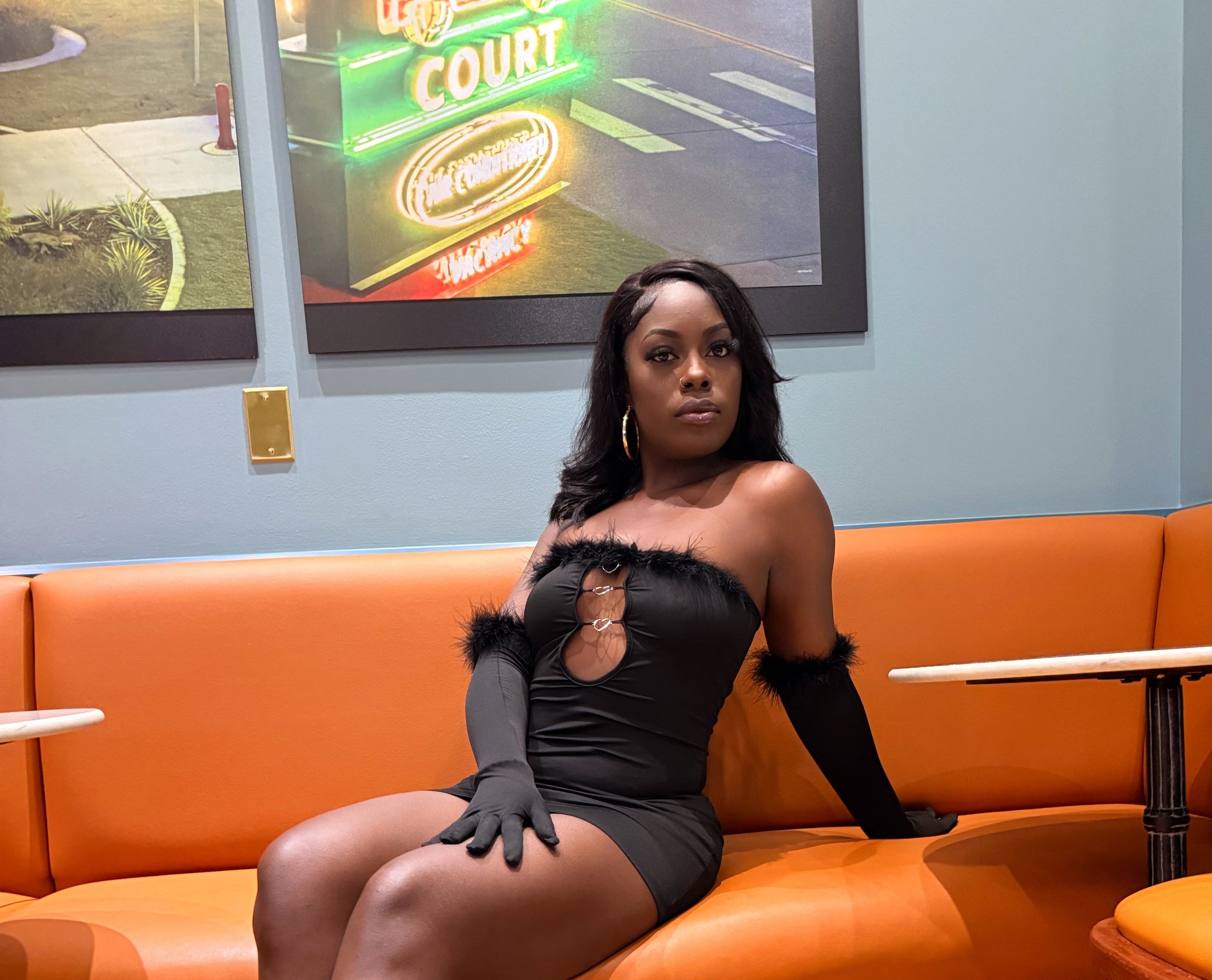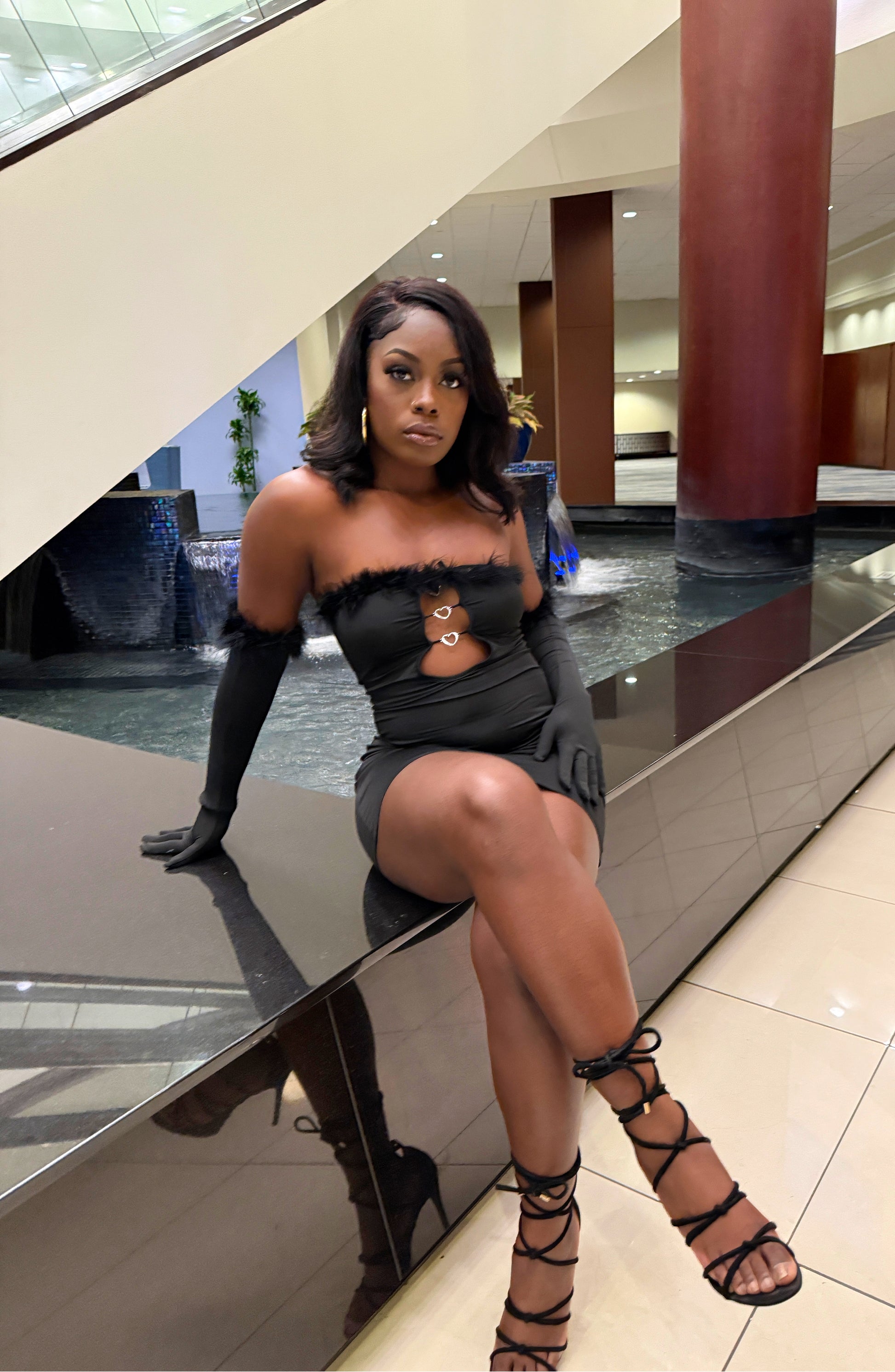 Beautiful Little Black Dress with Heart Shaped Forms. Fur Trim Gloves to match Fur Trim Dress. Get into it Ladies!